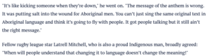 FitzSimons quoted Indigenous Australian and boxer Anthony Mundine, who said the anthem was “putting salt into the wound”; while rugby league player Latrell Mitchell noted that changing the language doesn’t “change the meaning”.