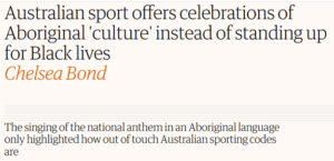 The Australian national rugby team sang the national anthem in an Indigenous language before their international rugby fixture. Two print outlets published Op-eds on it: The Guardian and The Sydney Morning Herald. One was written by Dr Chelsea Bond, a Munanjali and South Sea Islander woman, and senior lecturer at the University of Queensland’s Aboriginal and Torres Strait Islander Studies Unit. The other was written by Peter FitzSimons, a journalist and columnist with the SMH and a former Wallabies team member.