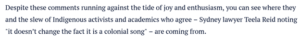 Lawyer and proud Wiradjuri and Wailwan woman Teela Reid said: “It doesn’t change the fact that it is a colonial song.”