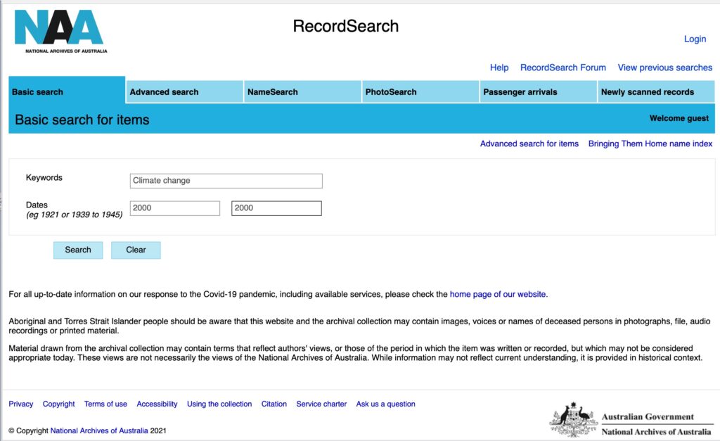 From the screen that appears, select “Basic search”, and enter the words “Climate change” and “2000” and “2000” in the date boxes (i.e. repeat “2000”).