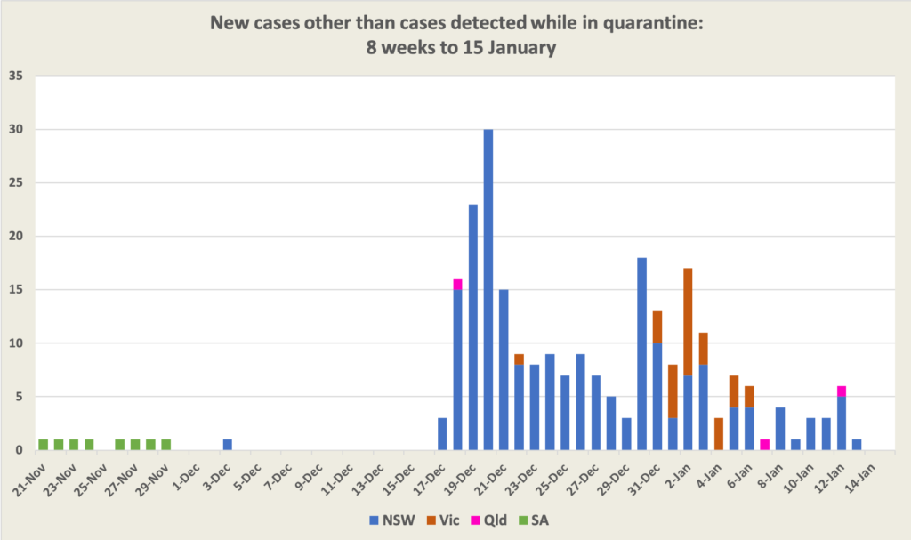 As at 15 December last year the infection numbers were suggesting that we had eliminated the virus (outside hotel quarantine). But by that stage, there had been at least one outbreak in New South Wales, which was to show up in the figures in the following days. Then there was another outbreak in New South Wales probably associated with transport of a quarantined patient. What we can reasonably say about these cases is that they are of a US strain and have come in through leakages in our hotel quarantine system – a system with many weak points. Although the graph shows cases in Victoria and Queensland, all have been traceable to the New South Wales outbreaks.