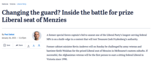 While Josh Frydenberg is the heir apparent to the leadership of the Liberals, his authority as the senior Victorian is set to be tested in the preselection battle for the seat of Menzies.