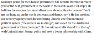 Despite extensive sleuthing, I could find no reference to “the best government in the world in the last 30 years”, even in Keating’s speech on Australia-China policy in 2019.