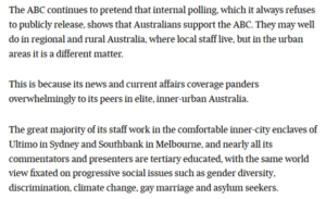 “(Australians) may well do in regional and rural Australia … but in urban areas it is a different matter.” Yet Australian urbanites – the “inner-city lefties” to whom the ABC panders – also support the ABC? I’m confused.