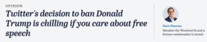 Dave Sharma’s criticism of Twitter silencing Donald Trump appeared sycophantic and poorly reasoned in equal measure.