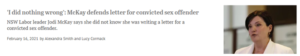 It’s hard from the articles to tell what the story actually is, but McKay appears to have, at worst, supported a letter of support. Supported a constituent in supporting someone in their community. It was in fact a pro forma letter. McKay categorically denied it as being a letter of support, but that didn’t stop the journalist running it as fact in the lead. Nor did it stop the Sydney Morning Herald running the standfirst that she wrote a letter of support.