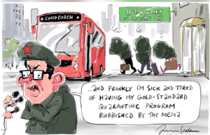 So rabid was the media response that people with Covid-19 who were moved from the Holiday Inn left with garbage bags over their head to keep their faces out of the media – good decision given they were plastered over the front page – but even the use of garbage bats was also the government’s fault, apparently.