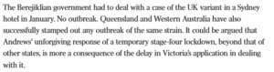 NewsCorp was practically frothing at the mouth with excitement. The Australian’s Simon Benson forgot to mention that the other states “stamped out” outbreaks due to lockdowns.