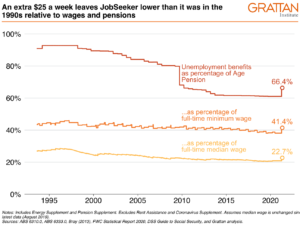 JobSeeker has fallen so low because allowance payments such as JobSeeker (and Youth Allowance) are adjusted only in line with changes in the cost of living, as measured by the Consumer Price Index (CPI). This means that a person on the unemployment benefit falls further and further behind other Australians, including age pensioners. This problem will continue.