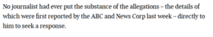 The Australian Financial Review parroted Porter’s idea that the rule of law would no longer exist if he should step down – a straw man argument, as the loudest calls have been made for the purposes of establishing an inquiry – as well as unchallengingly repeating his claim that the allegations had not been put to him by journalists.