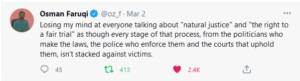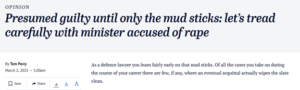Tom Percy, in The Sydney Morning Herald, reckoned the legal requirement of innocent until proven guilty had “surely, become reversed”. I wonder how that stacks up against data suggesting 3% of reported sexual assaults result in a conviction, while the vast majority of sexual violence is never reported to the police.
