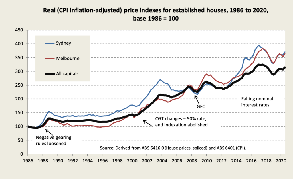 The ABS has produced its quarterly Residential Property Price Index for the December quarter, confirming that capital city house prices are once again on the way up. Private surveys, on which we reported last week, suggest that the boom is continuing into this year. Since a low point in mid 2019, the price of detached dwellings in our capital cities has risen by 11 per cent – 15 per cent in Sydney and 13 per cent in Melbourne, while apartment prices have risen a little more slowly. This has been over a period when wages have hardly risen.