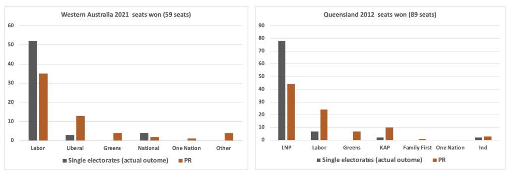 To illustrate an alternative to single-member electorates, had Western Australia been voting as one multi-member electorate – that is with proportional representation – Labor would still have a working majority (35 seats in the 59 seat parliament), the Liberals would hold 13 seats – enough to fill shadow ministries – and the Greens would hold 4 seats.