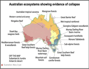 Ecosystem collapse is a very pressing issue for Australia, highlighted during the past week by a report identifying 19 of our own ecosystems that are already collapsing and unlikely to recover. As the report’s authors said in an article in The Conversation: ‘the current changes across the continent, and their potential outcomes, pose an existential threat to our survival, and other life we share the environments with.’ I strongly recommend this article for the brief description it contains of the 19 ecosystems and the major pressures each one faces. For a snapshot of the location of each ecosystem though, the map below is helpful.