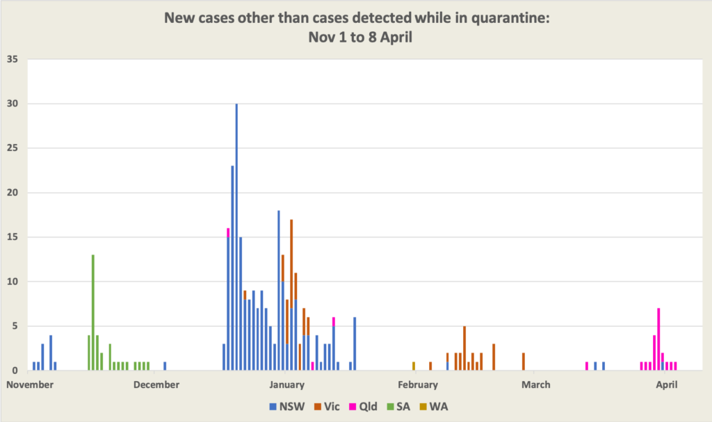 In relation to the New Zealand travel bubble, the risk of virus outbreaks in Australia and New Zealand will lead to caution. Below is a chart of outbreaks that have occurred since November, when Victoria had finally cleared up its major outbreak. Every clear run has been interrupted by a failure of border controls.