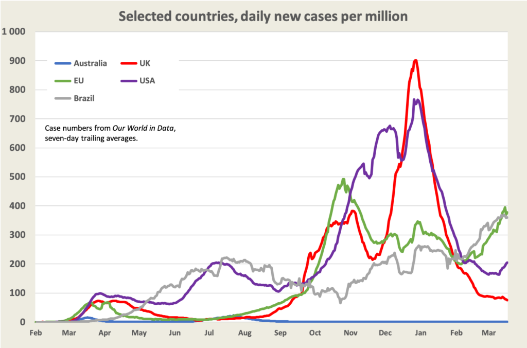 The UK stands out as the only large country to have brought the most recent outbreak under control. Its daily case rate is now 75 cases per million – about the same as Victoria’s at the peak of its outbreak last August. In the USA cases are once again rising. In Brazil Bolsonaro’s national government is doing all it can to frustrate city and state governments’ attempts to control the virus, and governments in neighbouring countries are under pressure to close their land and air borders as cases and deaths surge. Brazil now accounts for at least a quarter of the world’s daily deaths from Covid-19.