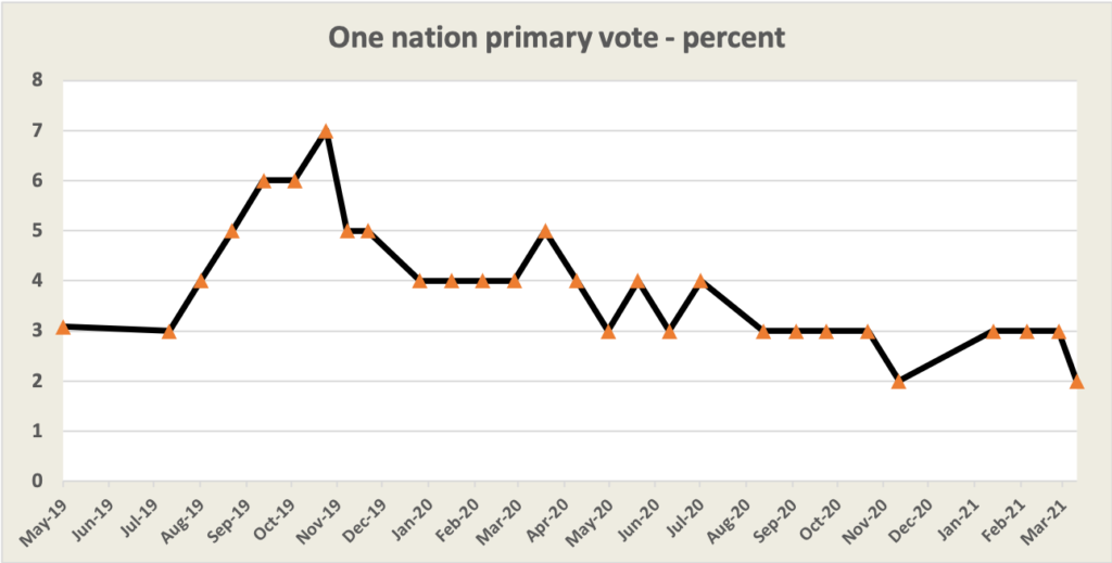 The One Nation primary vote is two per cent. Normally one should disregard numbers close to zero – the most accurate polling numbers are those that show up near the middle – but when small numbers show up in successive polls some of the noise of sampling error is diminished. Because this is the 27th poll since the election there is some evidence that while One Nation clawed its way back after the 2019 election (possibly because of the disappearance of Clive Palmer’s party), its support has been falling since late 2019.