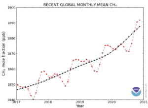 The increase in the level of methane in the atmosphere during 2020 (14.7 parts per billion) was the largest annual increase ever recorded.
