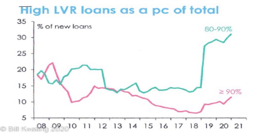 Furthermore, as shown in Chart 2 below, in the last few years there has been a significant rise in the proportion of housing loans that have a high LVR ratio (size of loan relative to the value of the property). These are the loans that are most at risk of falling into default when the burden of debt servicing increases, and as we saw in America during the global financial crisis, that can lead to forced sales and a collapse in property prices.