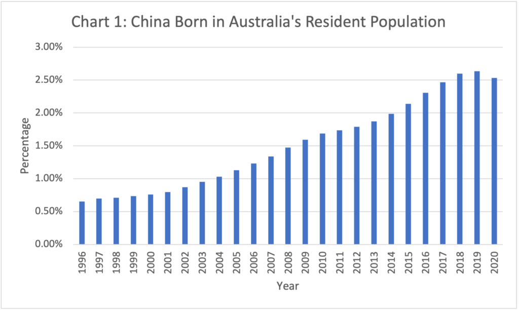 Migration to Australia from China had steadily increased driven largely by growth in the overseas student industry. The China born in Australia’s resident population in 1996 was 0.65 percent (118,640) and by 2019 had increased to 2.63 percent (667,960). 2020 was the first year in Australia’s recent history in which the percentage and absolute number of China born in Australia’s resident population fell (see Chart 1).