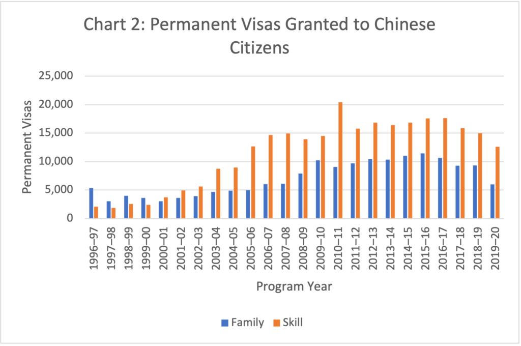 Permanent visas granted to Chinese citizens has declined since peaking in 2015-16 at 28,270 (see Chart 2). This decline was partly due to the smaller migration program but also due to a fall in applications from Chinese citizens.