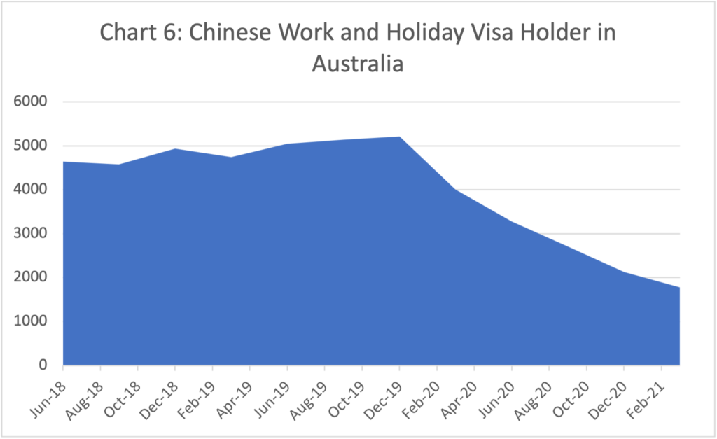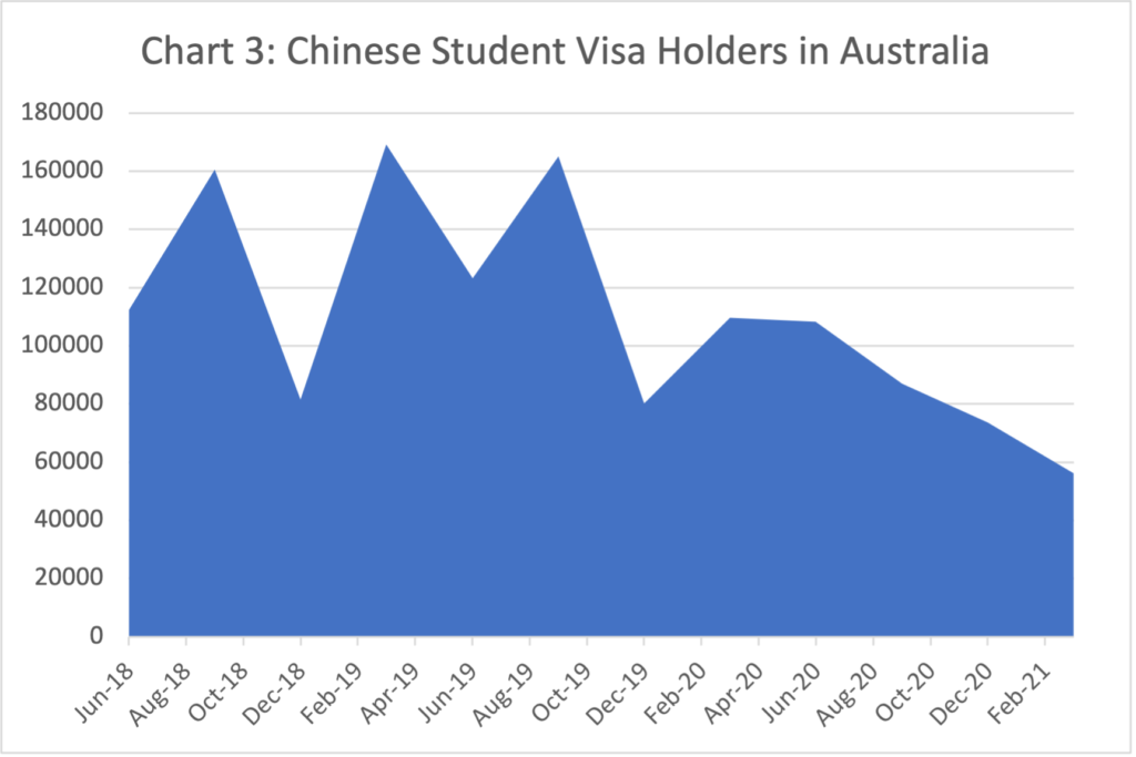 However, the number of Chinese temporary graduates in Australia fell in the last two quarters to March 2021. Temporary graduate numbers generally rise in the March quarter of each year but fell in the March quarter of 2021. This may partly be due to slow visa processing by Department of Home Affairs but is more likely the result of the steady decline in Chinese overseas students in Australia. This trend is likely to continue whist Australia-China relations remain paralysed.