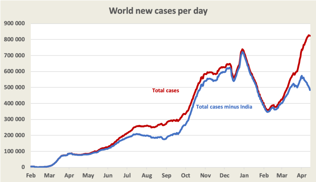 The rest of the world looks a little more promising. The graph below shows daily new cases worldwide, which are still rising (red line), but it also shows cases in the rest of the world other than India (blue line). In the world outside India total cases may have peaked a couple of weeks ago.