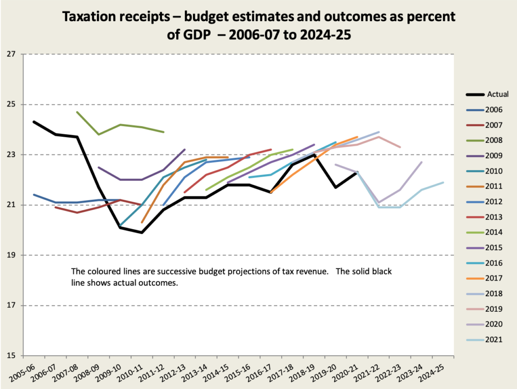 This revision can be seen in tax receipts. The graph below shows projections (coloured lines) and actual figures (thick black line) of tax receipts since 2006-07. Note that for the latest budget the pale blue line of projections lies below the mauve line for last year’s budget. Last year Treasury was more optimistic about taxation receipts – a clear indicator of economic health – than it is this year.