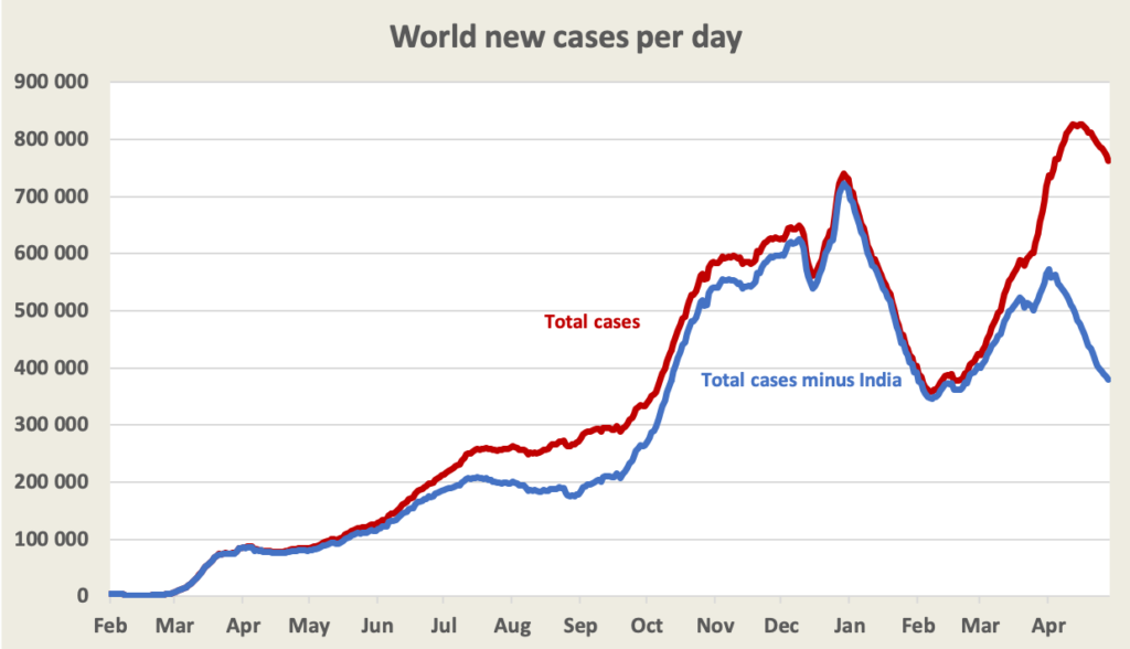 Again, it’s largely a story about India. Half of the world’s recorded cases last week were in India. Otherwise the world’s recorded case numbers are falling.