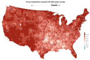 The map below shows the average temperatures across the contiguous USA for 1991-2020 compared with the 20th century average. Not many cooler areas. The link provides a further link to an animation that shows the change every 30 years during the 20th century. There are also maps for precipitation which is a lot more variable.