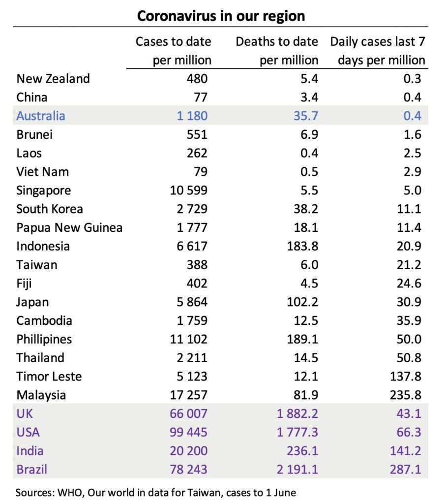 Until recently some countries in our region, including Vietnam and Taiwan, could be grouped with Australia and New Zealand, where the virus was effectively suppressed, but in both Vietnam and Taiwan there have been significant outbreaks. The source of Vietnam’s recent outbreak is unclear, but it has done well for a country with long land borders. Taiwan’s outbreak seems to be traceable to relaxed quarantine requirements for aircrew. Still, in these countries, as in most of east Asia, infection rates are low compared to rates earlier this year in the UK and the USA, where they were running well above 400 daily cases per million population. There is concern in Japan because the Olympics are due to start on July 23, but it seems that restrictions associated with a state of emergency are bringing infections down from their peak in mid-May. The country hardest hit recently is Malaysia, which has been grappling with relatively high infection rates since late last year, and is now experiencing a case rate almost as high as Brazil’s.