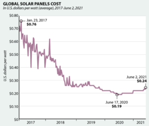Part of solar’s success is attributable to the rapid fall in prices over the last decade. Over the last year, however, the price of solar panels has increased from 19 to 24 US cents/watt. As the graph below demonstrates, this is not unprecedented, prices have shot up at times during the last 10 years, but the recent increase has been persisted for a while now. It’s less dramatic but it could affect tight profit margins. What’s gone wrong? Nothing much apparently. The price rise is due to the increasing cost of some raw materials such as polysilicon, steel and aluminium and increased shipping costs. According to one analyst, this shouldn’t affect the projected 27% increase in solar installation globally this year. However, if you’re thinking of putting some panels on your roof and have noticed the local price go up, you might want to delay until next year when prices are predicted to start heading down again.