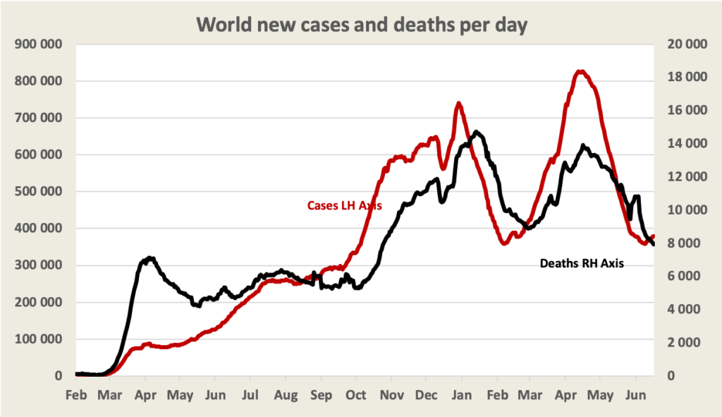 Worldwide, cases are rising once again. In most “developed” countries cases are falling, but the virus is spreading strongly in Africa and in South America.