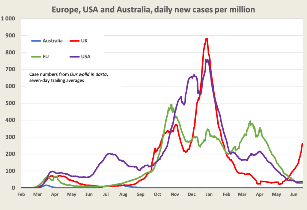 The surge in UK cases is probably associated with the Delta variant. So far there have been few deaths, perhaps because cases have been concentrated among younger people, but hospital admissions are now rising. Deaths will surely follow. Remaining restrictions are due to be lifted on July 19.