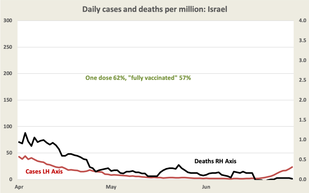 We can see a small rise in cases in Israel. Some of these are “breakthrough” cases – i.e. of people who are fully vaccinated – but they are not getting seriously ill.
