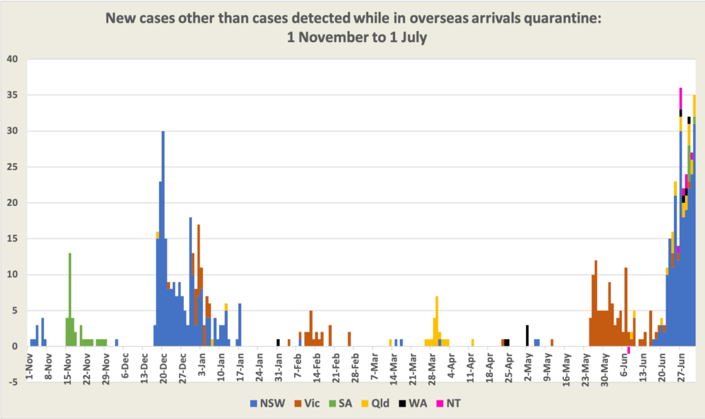 Our chart of daily local cases is looking more colourful as infected people travel around the country, and is resembling the early stages of last year’s outbreak in Victoria. But in the last few days it has fallen below the exponential trendline, many cases are in already-quarantined individuals, and there are few cases without clear links to other cases.