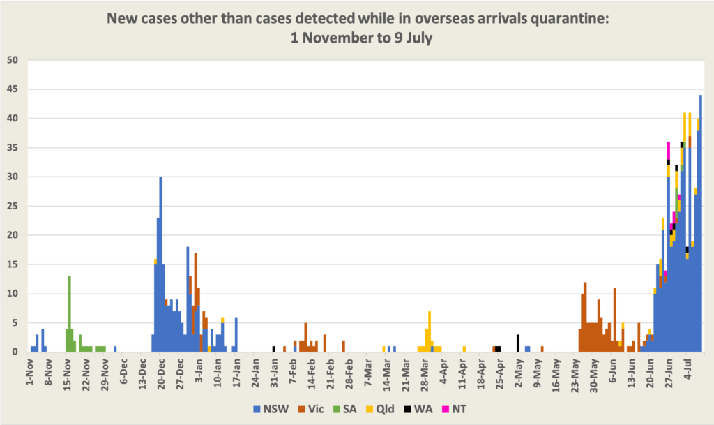 By November last year we had the virus eliminated, but because of easily avoidable failures in border controls we have had to live with suddenly-announced restrictions, upsetting personal and business plans, and generally dampening any economic activity more complex than personal services such as food service and hairdressing. While some states have had good runs free of restrictions, nationally there has been an almost continuous series of outbreaks, as shown on the graph below.