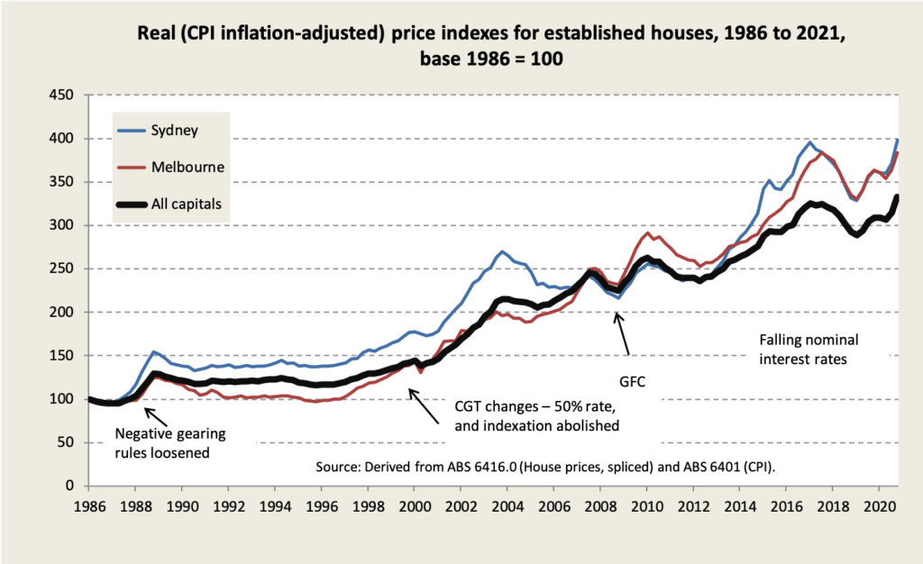 It’s hard to understand the RBA’s relaxed attitude to house prices. After a brief retreat towards sanity during the peak of the pandemic, capital city house prices hit a new record in the March quarter, with particularly strong rises in Sydney, Melbourne, Canberra and Hobart, as shown below. Why is the Reserve Bank so trapped by the arbitrary distinction between commodity price inflation (bad) and asset price inflation (of no concern)?