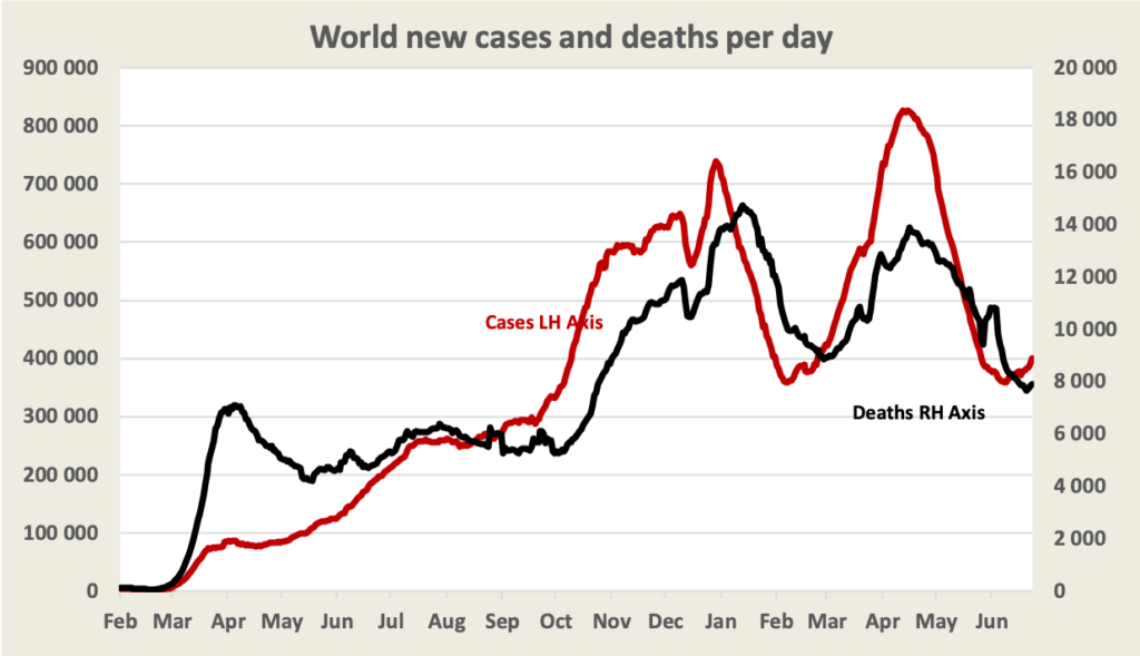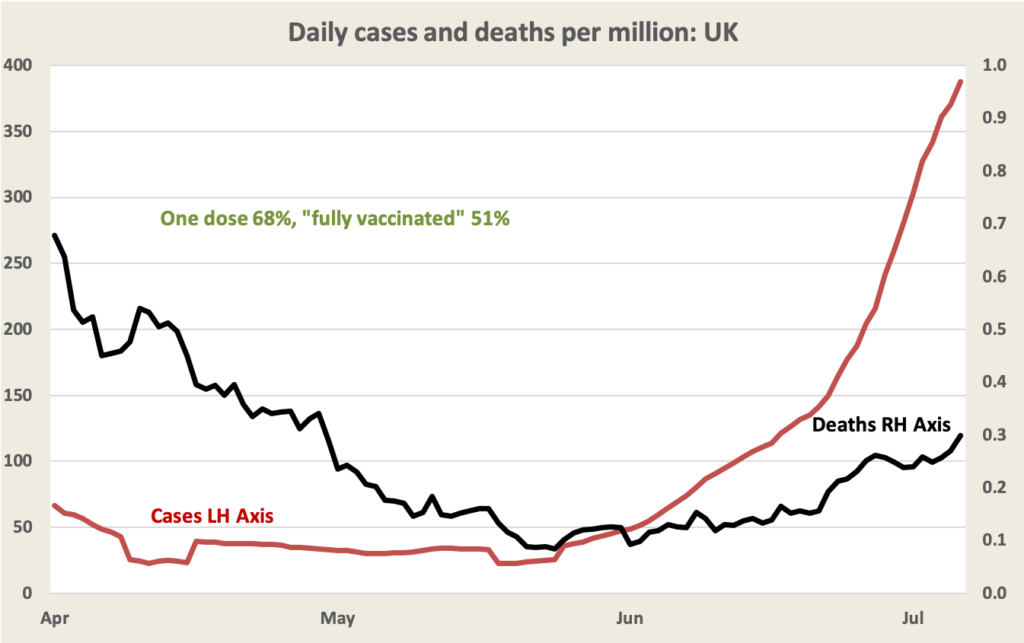 In the USA and the EU cases are no longer falling, but death rates are falling. In the USA states with low vaccination rates have rising cases, hinting at, but not confirming, a causal relationship between vaccination and Covid-19 cases. It is possible that those states with high vaccination are also the states with high Covid-19 consciousness where people are taking a suite of precautions. In the EU rates are rising strongly in Portugal, Spain and Cyprus, all tourist destinations. The WHO has noted football fans’ behaviour, for example, as a factor contributing to the virus’s spread.