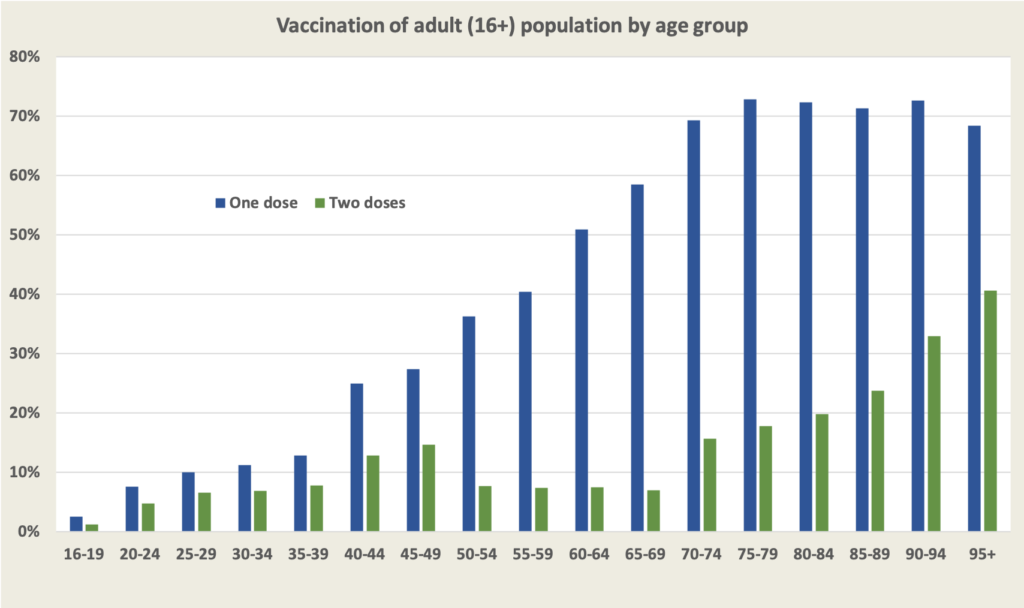 We note in the chart that it covers only the population older than 16. The general assumption so far has been that only older people are at most risk of catching the virus, and at risk of suffering severe consequences once they have caught it, but recent outbreaks of the Delta strain are forcing experts – and young people – to re-think that assumption, as Norman Swan explains on the ABC’s 730 Report: When should children start to get the COVID vaccine? (6 minutes).