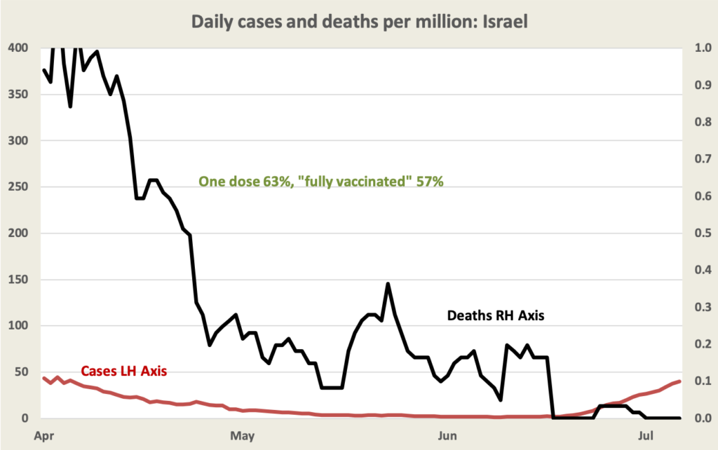 One European country where infection rates are rising rapidly is the UK (see the red line in the graph above). Politics.co.uk editor Ian Dunt attributes the rise in infections to Boris Johnson’s idiocy in opening the country’s borders to India, welcoming the Delta variant into the country. (Johnson is currently negotiating a trade deal with India.) But what is notable is that the rise in deaths has not been as sharp as the rise in cases. We expect a two to three week delay between cases and deaths, but even so the rise in deaths has been modest. We can see a similar pattern in Israel, another country with a high vaccination rate. Maybe we’re seeing the benefits of vaccination, maybe the Delta variant is less lethal, maybe treatments for Covid-19 are improving.