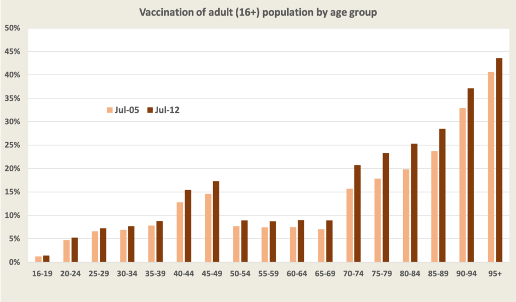 Nationally, vaccination is proceeding slowly: 33 per cent of adults have had a first dose and 12 per cent have had two doses (“full vaccination”), but there are significant differences by region and age. Smaller states and territories are well ahead of larger states, and older Australians are generally better vaccinated than younger people. Full vaccination rates by age are shown in the graph below as at July 12, compared with rates a week earlier. Notable features are the progress among the 70+ age group (people now getting their second dose), the low rate among the 50 to 70 group (people who got their first dose later), and the low rates among young people, almost certainly reflecting the shortage of mRNA vaccines. Note, too, that as yet there are no plans to vaccinate people under 16.