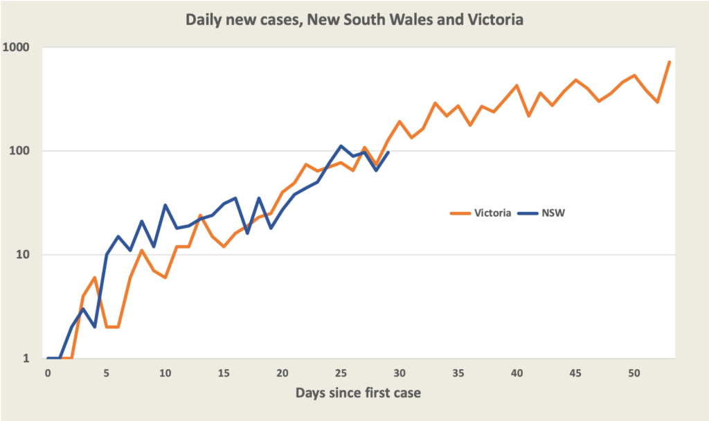 At this stage we have to be sceptical about any notion that it will soon be under control. In spite of better contact-tracing, the trajectory of this outbreak looks very similar to that of Melbourne’s big outbreak. The graph below shows Victoria’s (essentially Melbourne’s) daily cases in 2020 from the time the first locally-transmitted case was detected, up to the daily peak of 723 cases 53 days later. Superimposed on a blue line is the same series for New South Wales (essentially Sydney) this year. We have used a logarithmic scale to illustrate the similarity: maybe it’s flattening but five days’ data does not constitute a trend. The most sobering figure from Victoria is that it took 145 days of strong restrictions before there was a clear run of zero cases.