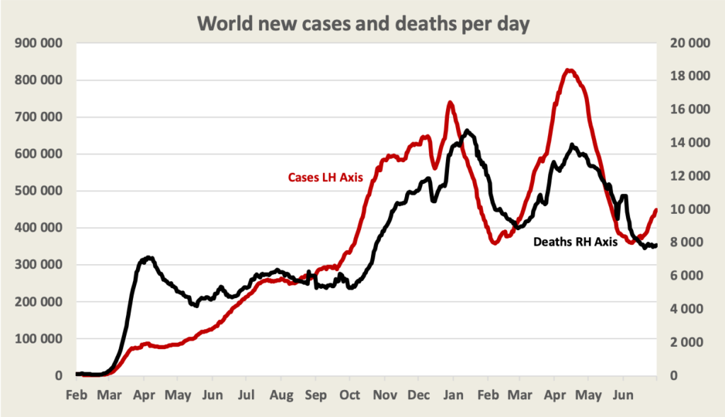 Below is the updated graph of world cases and deaths. The recent growth in cases is probably due to the spread of the Delta variant. Deaths are not rising, but there is always a lag of a few weeks between cases and deaths. The WHO reports that in the past week the eastern Mediterranean region experienced the largest increase in cases, but that Africa and east Asia experienced a high increase in deaths.