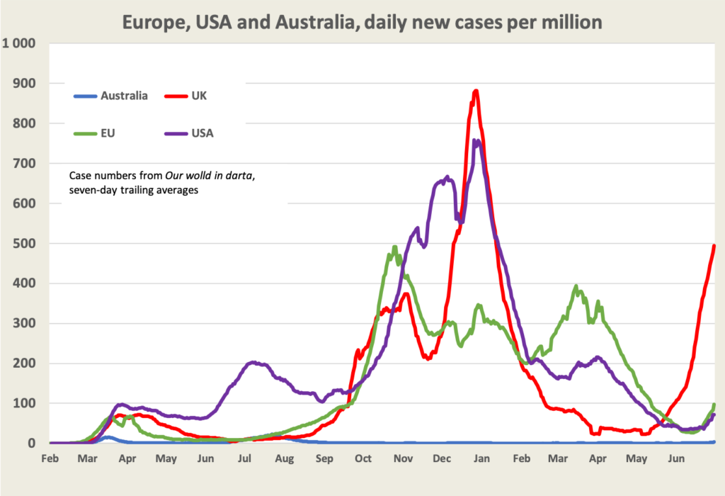There has been no shortage of media coverage about the Sydney outbreak: it’s serious. As David Speers writes, the New South Wales and Commonwealth governments acknowledged that the virus is far more infectious than previous strains, but acted as though it isn’t. Just as the New South Wales Government was slow in imposing restrictions, it has been half-hearted and muddled in their design. Anne Davies points out in The Guardian that the New South Wales Government has refused to define “essential workers” and has left retail businesses to decide for themselves whether to open: Words fail Berejiklian government as ‘essential’ NSW workers remain a mystery.