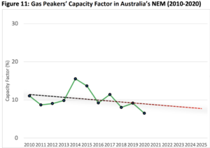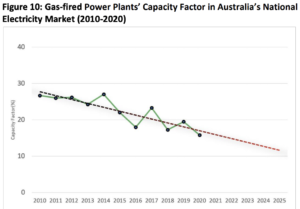 The Australian government is providing $600 million dollars to Snowy Hydro to build a new gas peaker or dispatchable gas power plant at Kurri Kurri in the NSW Hunter Valley. The government’s logic is that this is needed to maintain the reliability of the electricity grid after the Liddell coal-fired power station closes in 2023. The investment has been criticised as unnecessary. The Kurri Kurri plant is predicted to operate for only 2.5% of the year and there will be sufficient electricity supply to manage demand without it. The Institute for Energy Economics and Financial Analysis (IEEFA) has now also shown that the government’s financial modelling is based on a false assumption: specifically, that the new plant will maintain a constant capacity factor over its lifetime. History tells us that this is not the case. The two graphs below demonstrate that the average capacity factor of all the gas-fired power plants in Australia’s (eastern states) National Electricity Market fell from 27% in 2010 to 16% in 2020, and that the capacity factor of only the gas peaker plants fell from 12% to 7%.
