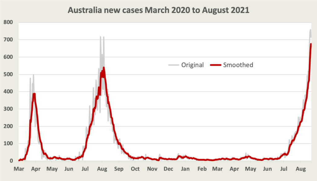 A glance at the graph confirms that, unlike last year’s outbreak, the curve is not bending over. Within New South Wales the virus has been on a remarkably consistent growth trajectory since mid-July, with a daily compounding growth rate of 5.7 per cent. (For the mathematically obsessed the equation for daily cases is 77.293 x e0.0558 x, where x is the number of days since July 15. The coefficient of correlation is 0.98.) By our projections New South Wales is on track to reach 1800 cases a day by the end of the month. This estimate, based on a simple mathematical projection, may be optimistic: some experts are talking about 2000 cases a day by the end of the month, and according to Norman Swan there has been a rise in the test positivity rate that could show up in coming days.