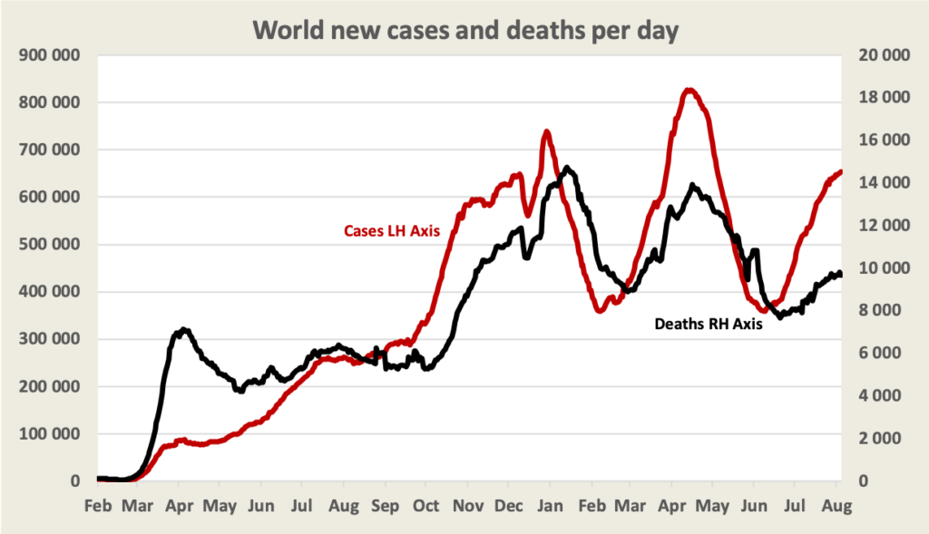 We have updated the world-wide graph. Note that the red and black lines of cases and deaths, which were closely related with A short lag, seem to have parted company. Because the case numbers are probably significantly understated, the impression one gains is that the virus is killing fewer people. That’s not to suggest it’s less deadly: the probable explanation lies in more vulnerable people being protected by vaccination.