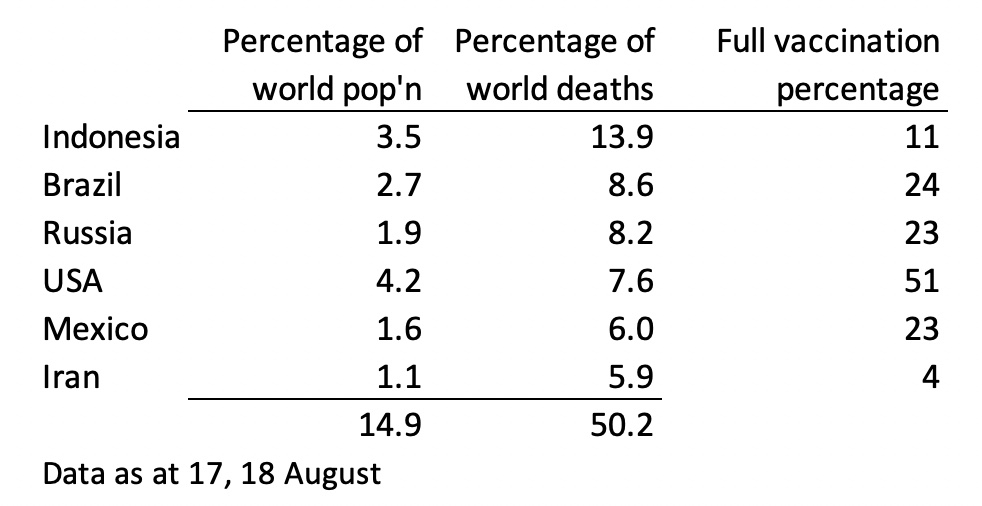 Some may be surprised to find the USA on that list. At 51 per cent of its total population its vaccination rate is only a little below Australia’s short-term target of 70 per cent of the adult population, which equates to 56 per cent of our total population. But last week the USA had 5151 deaths, which, scaling for population, would equate to about 400 deaths in Australia.
