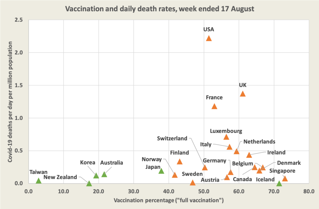 We have marked in green island countries with strong border controls – countries pursuing policies of local elimination. (OK Korea isn’t an island, but the DMZ is a pretty solid barrier.) What remains is a group dominated by mainland European countries with reasonably high rates of vaccination and daily death rates well below 1.0 per million, with three outliers – France, the UK and the USA. (There is some noise in the death rates near the axis – Austria, for example, had only 6 deaths last week.)